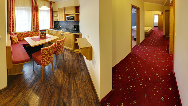 Neu sind auch 2 Hotelappartement mit 60m² für 2 bis 6 Personen, ausgestattet wie die Suiten inkl. zusätzlichem Küchenteil mit Kühlschrank, Kochplatten, Mikrowelle, Abwasch, Kaffeemaschine, Geschirr, Arbeitsfläche und gemütliche Sitzecke für 6 Personen.